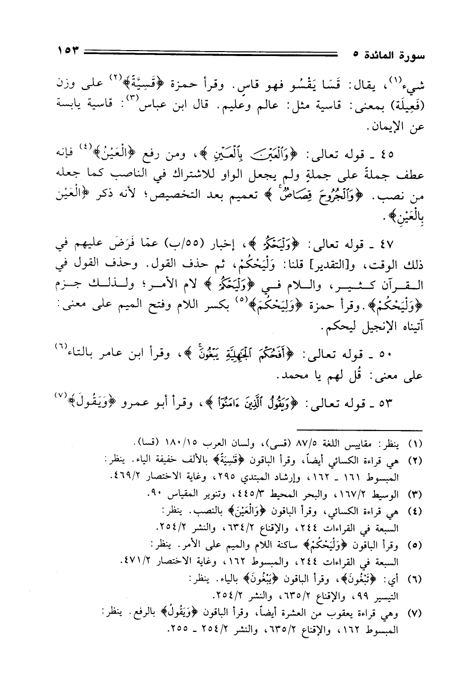 45 - قوله تعالى: (وَالْعَيْنَ بِالْعَيْنِ)، ومن رفع (الْعَيْنُ) فإنه عطف جملة على جملةٍ ولم يجعل الواو للاشتراك في الناصب كما جعله من نصب. (وَالْجُرُوحَ قِصَاصٌ) تعميم بعد التخصيص؛ لأنه ذكر (الْعينَ بِالعَيْنِ).
