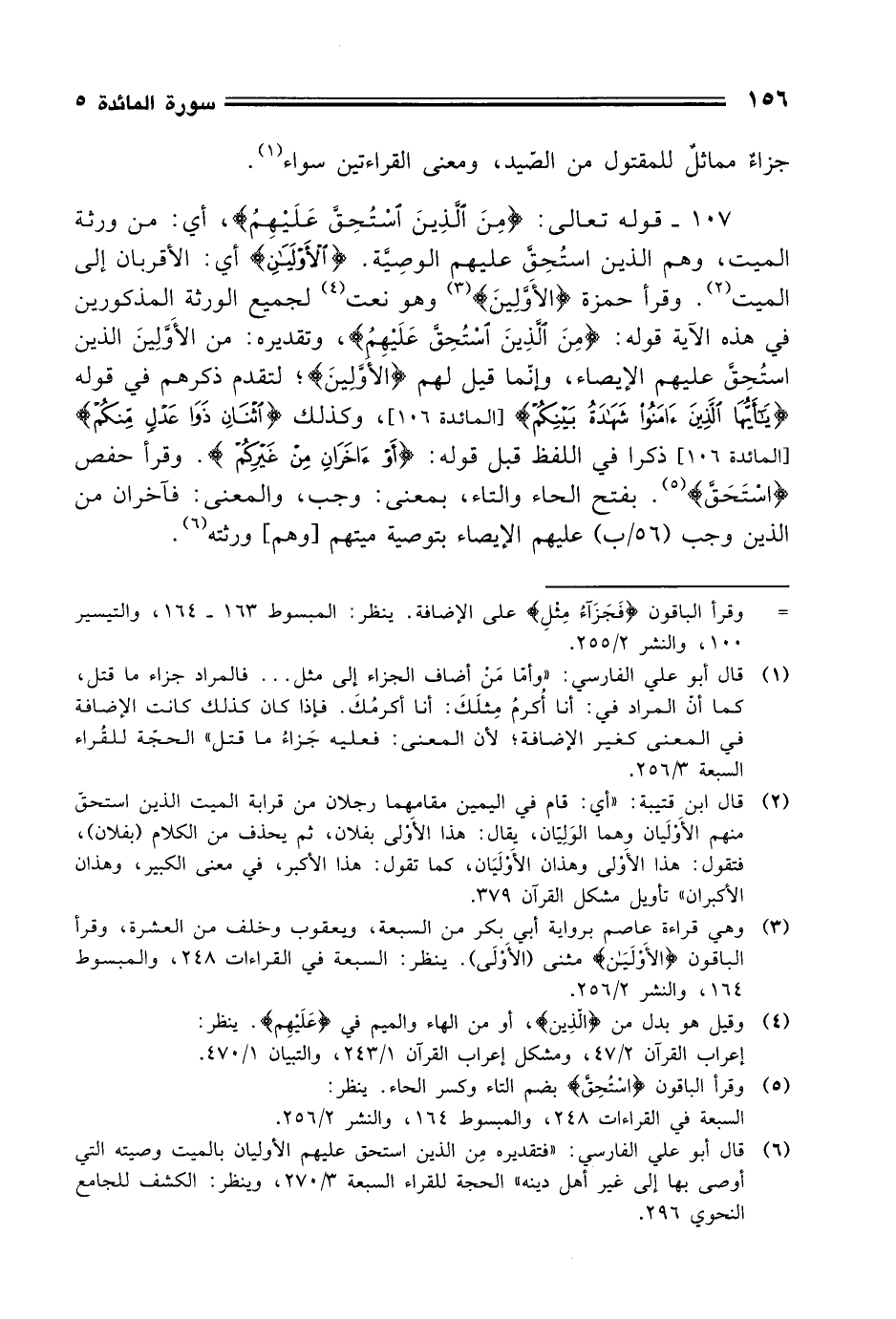 107 - قوله تعالى: (مِنَ الَّذِينَ اسْتُحِق عَلَيْهِمُ)، أي: من ورثة الميت، وهم الذين استُحِق عليهم الوصِية. (الأَولَيَنِ) أي: الأقربان إلى الميت. وقرأ حمزة (الأَوَّلِينَ) وهو نعت لجميع الورثة المذكورين في هذه الآية قوله: (مِنَ الَّذِينَ اسْتُحِق عَلَيْهِمُ)، وتقديره: من الأَوَّلِينَ الذين استُحِقَّ عليهم الإيصاء، وإنّما قيل لهم (الأولِينَ)؛ لتقدم ذكرهم في قوله (يَا أَيُّهَا الَّذِينَ آمَنُوا شَهَادَةُ بَيْنِكُمْ)، وكذلك (اثْنَانِ ذَوَا عَدْلٍ مِنْكُمْ)، ذكرا في اللفظ قبل قوله: (أَوْ آخَرَانِ مِنْ غَيْرِكُمْ). وقرأ حفص (اسْتَحَق). بفتح الحاء والتاء، بمعنى: وجب، والمعنى: فآخران من الذين وجب عليهم الإيصاء بتوصية ميتهم [وهم] ورثته.