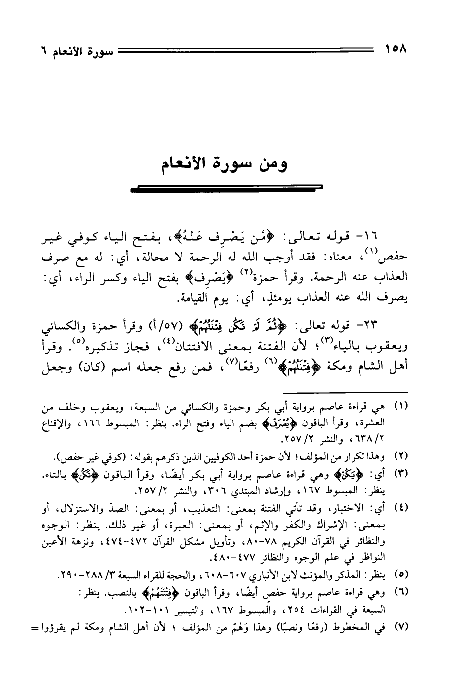 23 - قوله تعالى: (ثُمَّ لَمْ تَكُنْ فِتْنَتُهُمْ) وقرأ حمزة والكسائي ويعقوب بالياء؛ لأن الفتنة بمعنى الافتتان، فجاز تذكيره. وقرأ أهل الشام ومكة (فِتْنَتُهُمْ) رفعًا، فمن رفع جعله اسم (كان) وجعل