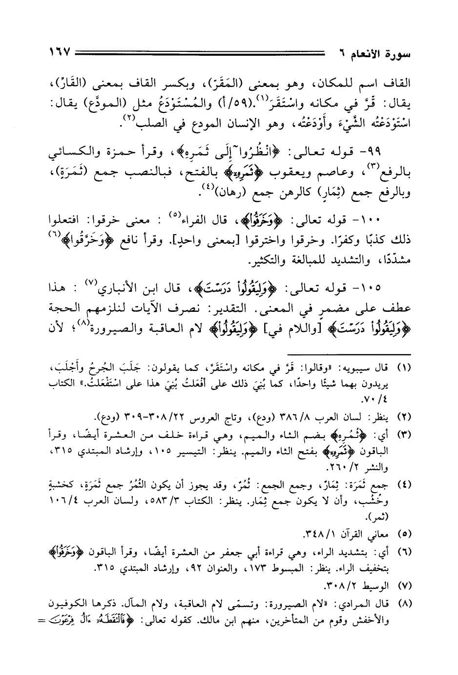 99 - قوله تعالى: (انْظُرُوا إِلَى ثَمَرِهِ)، وقرأ حمزة والكسائي بالرفع، وعاصم ويعقوب (ثَمَرِهِ) الفتح، فبالنصب جمع (ثَمَرَةٍ)، وبالرفع جمع (ثِمَارٍ) كالرهن جمع (رهان).