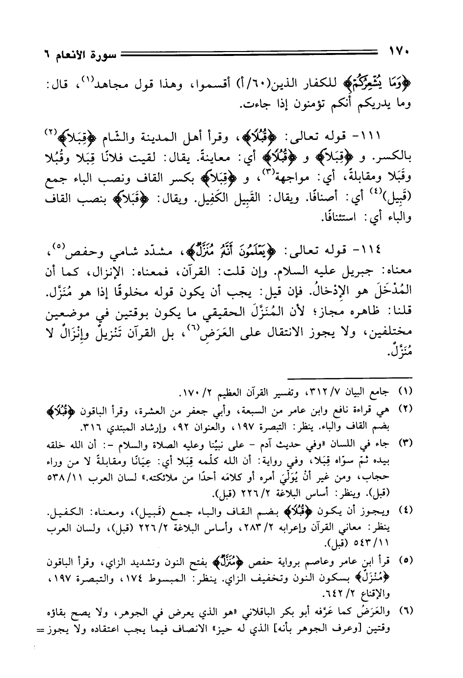 111 - قوله تعالى: (قبُلًا)، وقرأ أهل المدينة والشّام (قِبَلًا) بالكسر. و (قِبَلًا) و (قُبُلًا) أي: معاينة. يقال: لقيت فلانًا قِبَلا وقُبُلا وقَبَلا ومقابلةً، أي: مواجهة، و (قِبَلا) بكسر القاف ونصب الباء جمع (قَبيل) أي: أصنافًا. ويقال: القَبِيل الكَفِيل. ويقال: (قَبَلا) بنصب القاف والباء أي: استئنافًا.