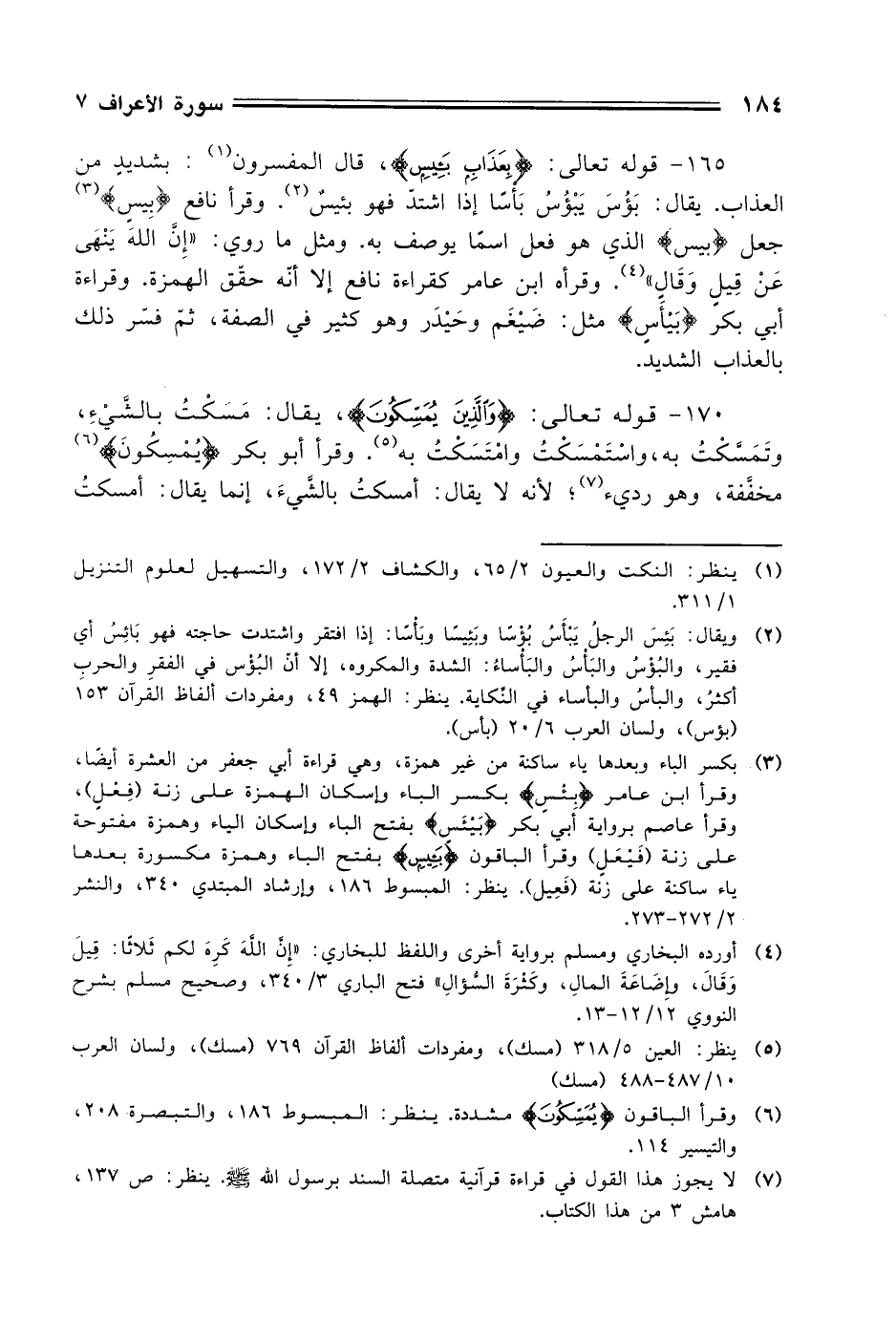 165 - قوله تعالى: (بِعَذَابٍ بَئِيسٍ)، قال المفسرون: بشديدٍ من العذاب. يقال: بَؤُسَ يَبْؤُسُ بَأسًا إذا اشتدّ فهو بئيسٌ. وقرأ نافع (بِيسٍ) جعل (بيسٍ) الذي هو فعل اسمًا يوصف به. ومثل ما روي: "إِن اللهَ يَنْهَى عَنْ قِيلٍ وَقَالٍ ". وقرأه ابن عامر كقراءة نافع إلا أنه حقق الهمزة. وقراءة أبي بكر (بَيْأَسٍ) مثل: ضيْغَم وحَيْدَر وهو كثير في الصفة، ثم فسّر ذلك بالعذاب الشديد.