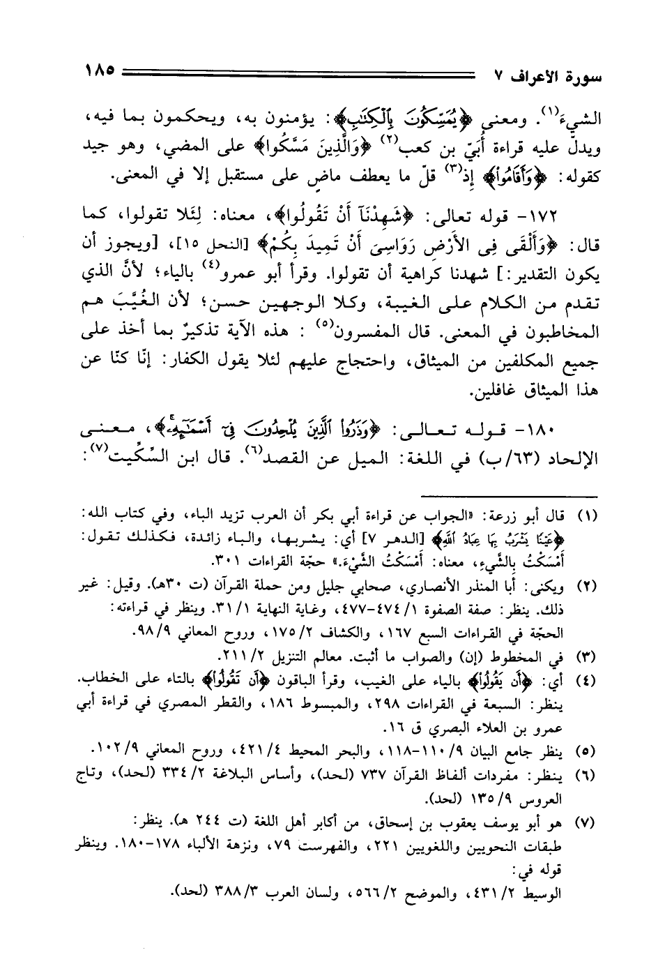 172 - قوله تعالى: (شَهِدْنَآ أَنْ تَقُولُوا)، معناه: لِئَلا تقولوا، كما قال: (وَأَلْقَى فِي الْأَرْضِ رَوَاسِيَ أَنْ تَمِيدَ بِكُمْ)، ويجوز أن يكون التقدير:، شهدنا كراهية أن تقولوا. وقرَأ أبو عمرو بالياء؛ لأن الذي تقدم من الكلام على الغيبة، وكلا الوجهين حسن؛ لأن الغُيَّبَ هم المخاطبون في المعنى. قال المفسرون: هذه الآية تذكير بما أخذ على جميع المكلفين من الميثاق، واحتجاج عليهم لئلا يقول الكفار: إنا كنا عن هذا الميثاق غافلين.