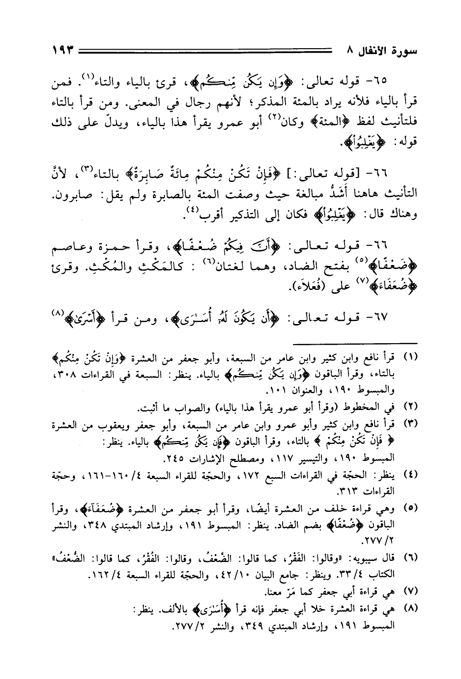 65 - قوله تعالى: (وَإِنْ يَكُنْ مِنْكُمْ)، قرئ بالياء والتاء. فمن قرأ بالياء فلأنه يراد بالمئة المذكر؛ لأنهم رجال في المعنى. ومن قرأ بالتاء فلتأنيث لفظ (المئة) وكان أبو عمرو يقرأ هذا بالياء، ويدلّ على ذلك قوله: (يَغْلِبُوا).