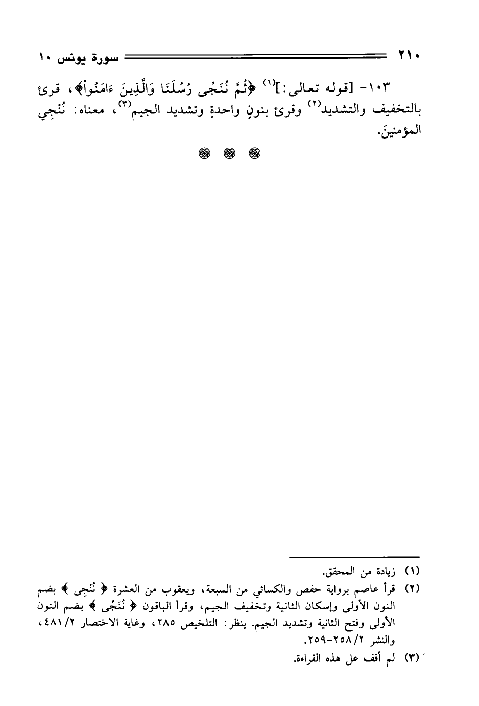 103 - [قوله تعالى:] (ثُمَّ نُنَجِّي رُسُلَنَا وَالَّذِينَ آمَنُوا)، قرئ بالتخفيف والتشديد وقرئ بنونٍ واحدةٍ وتشديد الجيم، معناه: نُنْجِي المؤمنينَ.