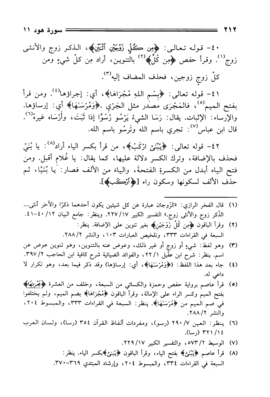 40 - قوله تعالى: (مِنْ كُلِّ زَوْجَيْنِ اثْنَيْنِ)، الذكر زوج والأنثى زوج. وقرأ حفص (مِن كُلٍّ) بالتنوين، أراد مِن كلِّ شيءٍ ومن كل زوجٍ زوجين، فحذف المضاف إليه.