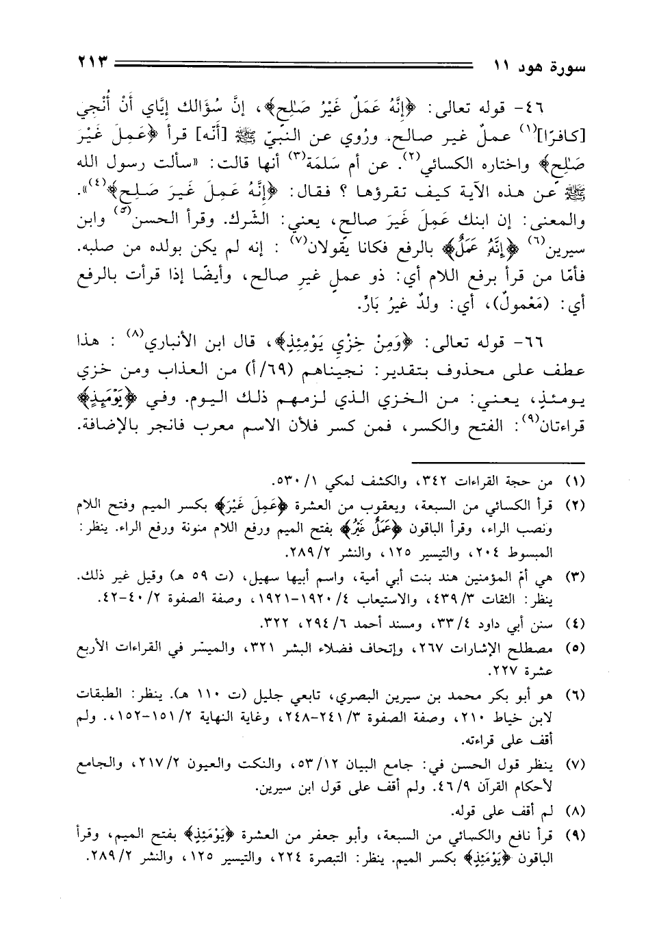 46 - قوله تعالى: (إِنَّهُ عَمَلٌ غَيْرُ صَالِحٍ)، إنَّ سُؤَالك إِيَّاي أَنْ أنْجِي [كافرًا] عملٌ غير صالح. ورُوي عن النَبيّ - صلى الله عليه وسلم -[أَنه] قرأ (عَمِلَ غَيْر صَالِحٍ) واختاره الكسائي. عن أم سَلمَة أنها قالت: "سألت رسول الله - صلى الله عليه وسلم - عن هذه الآية كيف تقرؤها؛ فقال: (إِنَّهُ عَمِلَ غَيرَ صَالِحٍ) ".