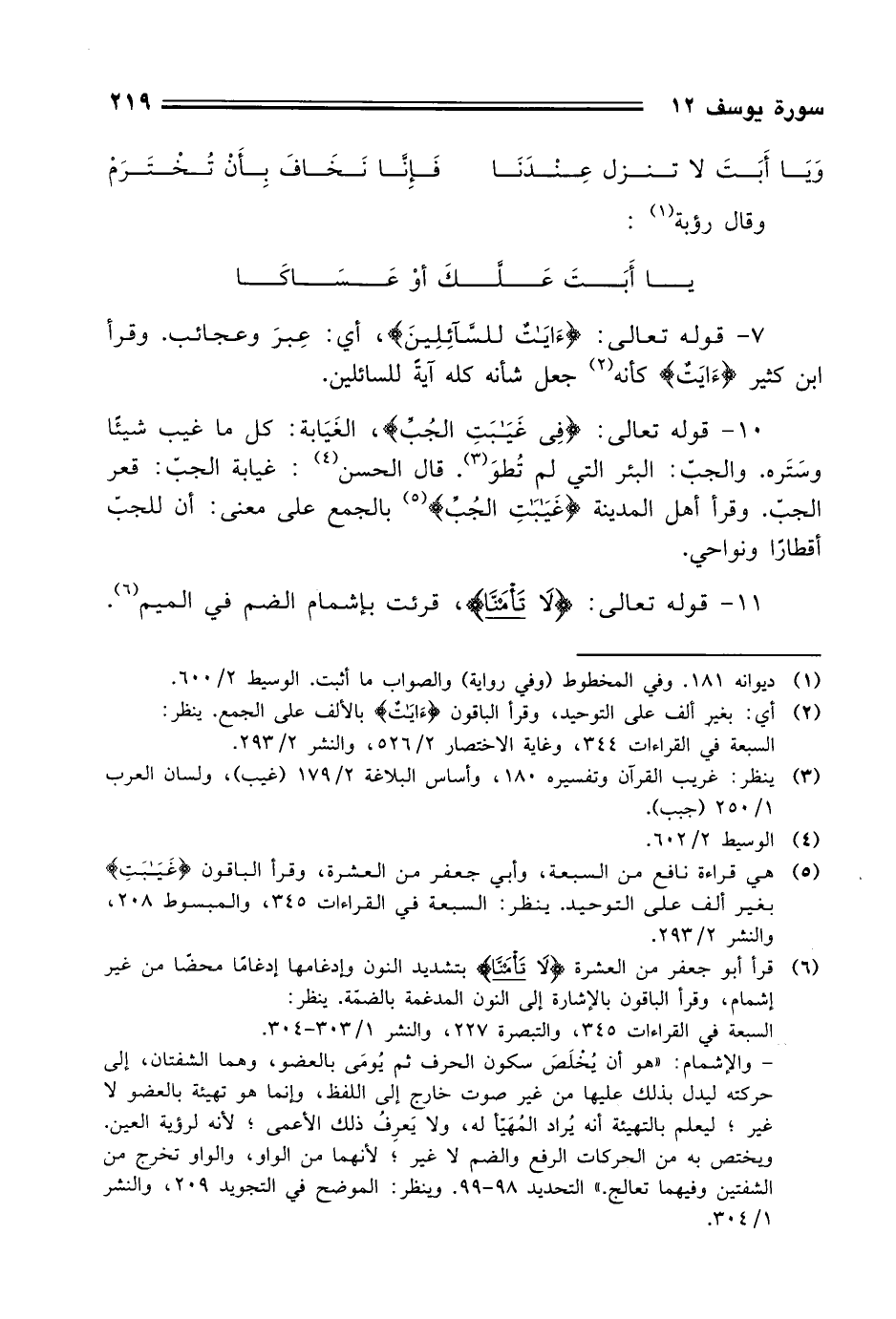 11 - قوله تعالى: (لَا تَأْمَنَّا)، قرئت بإشمام الضم في الميم.