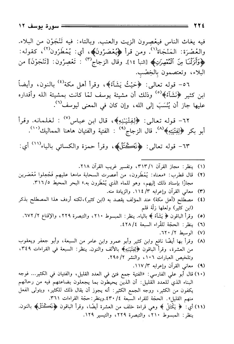 56 - قوله تعالى: (حَيْثُ يَشَآءُ)، وقرأ أهل مكة بالنون، وأيضًا ابن كثير (نَشَآءُ) وذلك أن مشيئة يوسف لمّا كانت بمشيئة الله وأقداره عليها جاز أن يُنْسَبَ إلى الله، وإن كان في المعنى ليوسف.