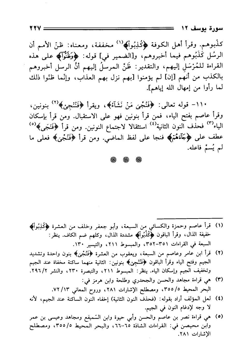 110 - قوله تعالى: (فَنُجِّيَ مَنْ نَشَاءُ)، ويقرأ (فَنُنْجِي) بنونين، وقرأ عاصم بفتح الياء، فمن قرأ بنونين فهو على الاستقبال. ومن قرأ بإسكان الياء فحذف النون الثانية استثقالا لاجتماع النونين. ومن قرأ (فَنَجَى) عطف على (جَآءَهُم) فنجا على لفظ الماضي. ومن قرأ (فَنُجِّيَ) فعلى ما لم يُسمَّ فاعله.