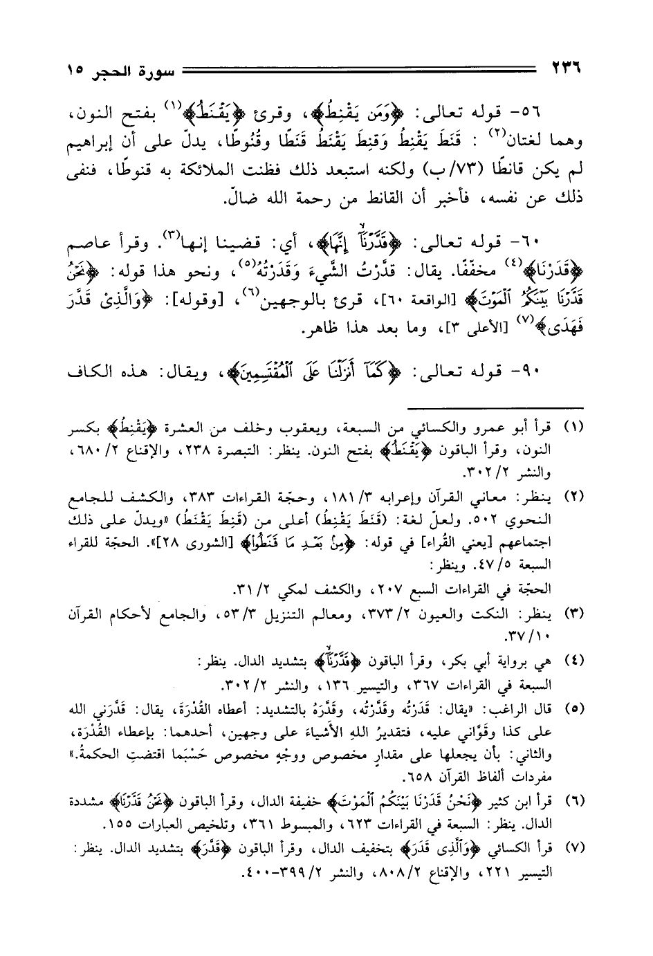 56 - قوله تعالى: (وَمَن يَقْنِطُ)، وقرئ (يَقْنَطُ) بفتح النون، وهما لغتان: قَنَطَ يَقْنِطُ وَقنِطَ يَقْنَطُ قَنَطًا وقُنُوطًا، يدل على أن إبراهيم لم يكن قانطًا ولكنه استبعد ذلك فظنت الملائكة به قنوطًا، فنفى ذلك عن نفسه، فأخبر أن القانط من رحمة الله ضال.