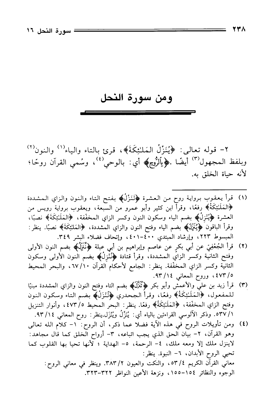 2 - قوله تعالى: (يُنَزِّلُ الْمَلَائِكَةَ)، قرئ بالتاء والياء والنون وبلفظ المجهول أيضًا. (بِالرُّوحَ) أي: بالوحي، وسُمي القرآن رُوحًا , لأنه حياة الخلق به.
