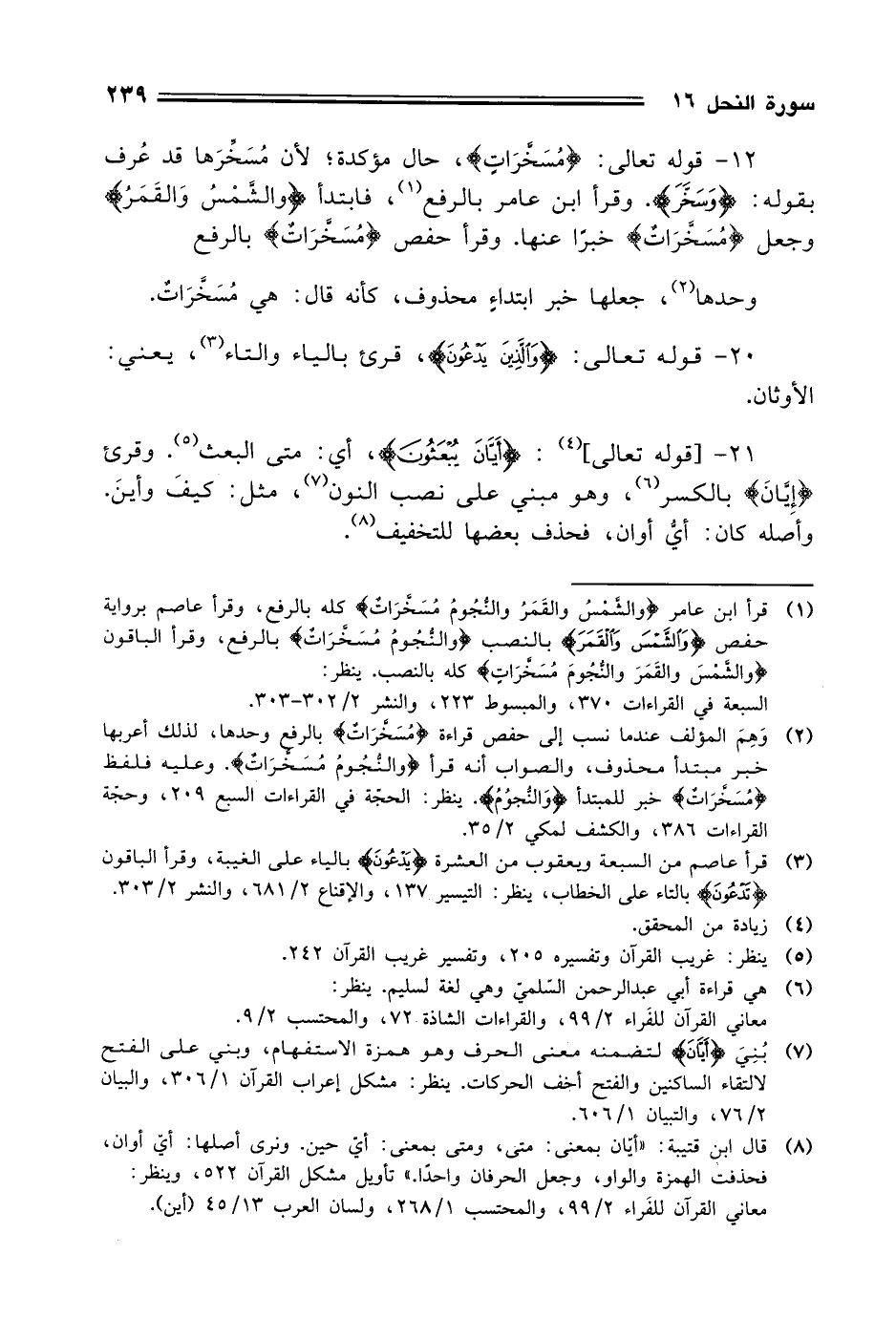 12 - قوله تعالى: (مُسَخرَاتٍ)، حال مؤكدة؛ لأن مُسَخِّرَها قد عُرف بقوله: (وَسَخَّرَ). وقرأ ابن عامر بالرفع، فابتدأ (والشَّمْسُ وَالقَمَرُ) وجعل (مُسَخرَاتٌ) خبرًا عنها. وقرأ حفص (مُسَخرَاتٌ) بالرفع وحدها، جعلها خبر ابتداءٍ محذوف، كأنه قال: هي مُسَخرَاتٌ.