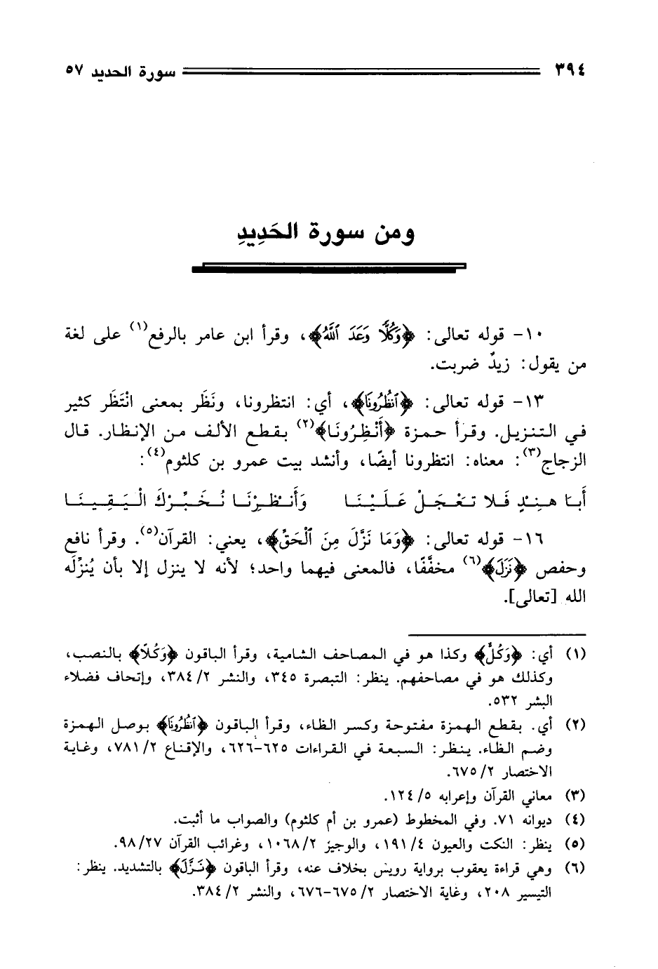 16 - قوله تعالى: (وَمَا نَزَّلَ مِنَ الْحَقِّ)، يعني: القرآن. وقرأ نافع وحفص (نَزَلَ) مخففًا، فالمعنى فيهما واحد؛ لأنه لا ينزل إلا بأن يُنزِّلَه الله تعالى.