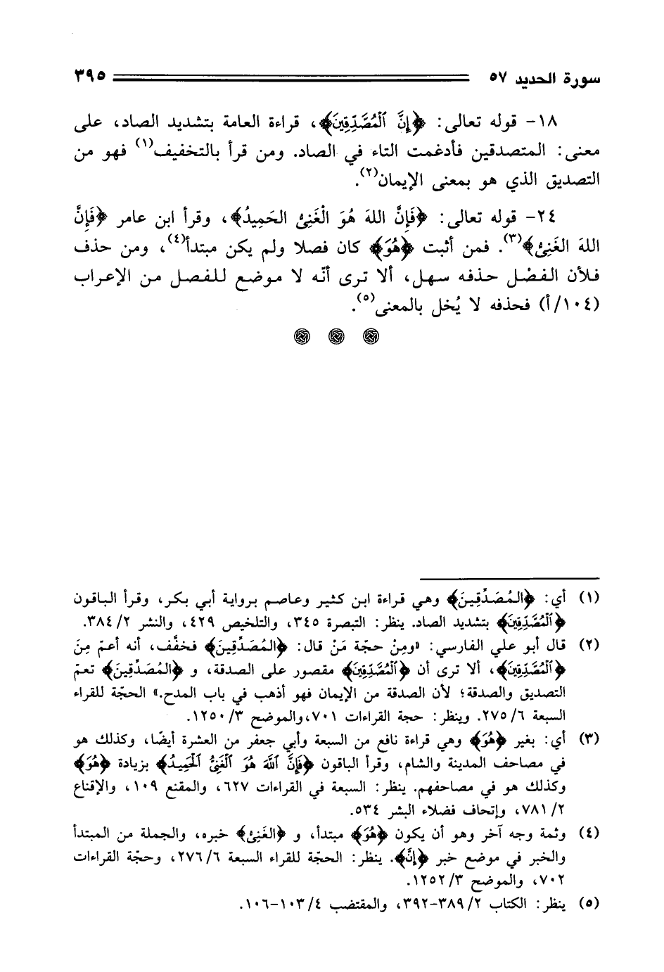 18 - قوله تعالى: (إِنَّ الْمُصَّدِّقِينَ)، قراءة العامة بتشديد الصاد، على معنى: المتصدقين فأُدغمت التاء في الصاد. ومن قرأ بالتخفيف فهو من التصديق الذي هو بمعنى الإيمان.
