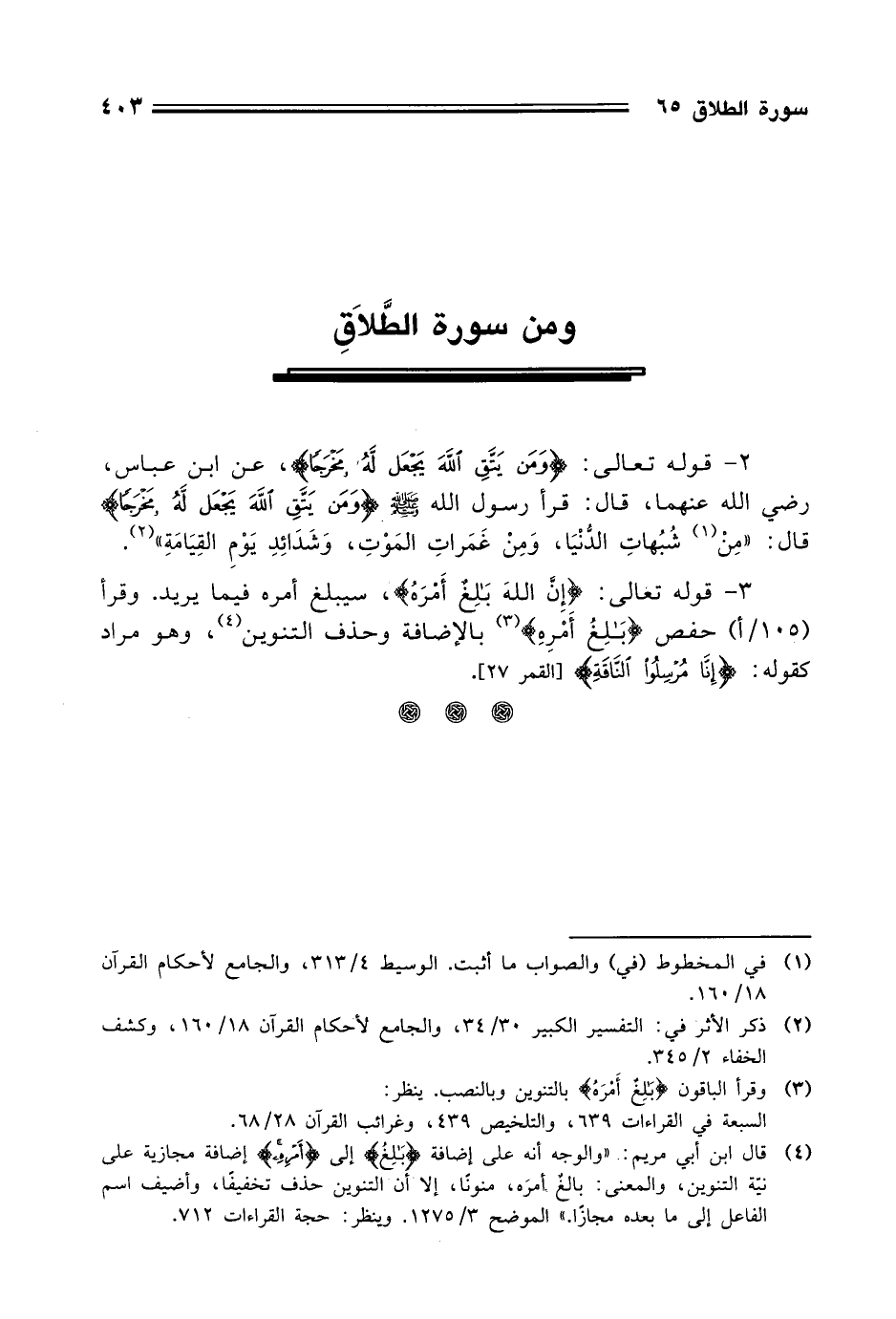 3 - قوله تعالى: (إِنَّ اللَّهَ بَالِغٌ أَمْرَهُ)، سيبلغ أمره فيما يريد. وقرأ حفص (بَالِغُ أَمْرِهِ) بالإضافة وحذف التنوين، وهو مراد كقوله: (إِنَّا مُرْسِلُو النَّاقَةِ).