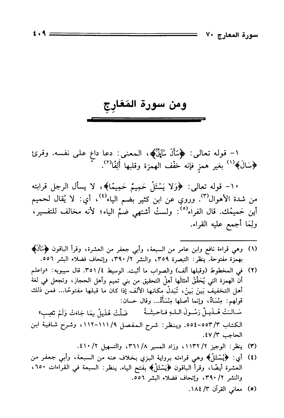 1 - قوله تعالى: (سَأَلَ سَائِلٌ)، المعنى: دعا داعٍ على نفسه. وقرئ (سَالَ) بغير همزٍ فإنه خفّف الهمزة وقلبها أَلِفًا.