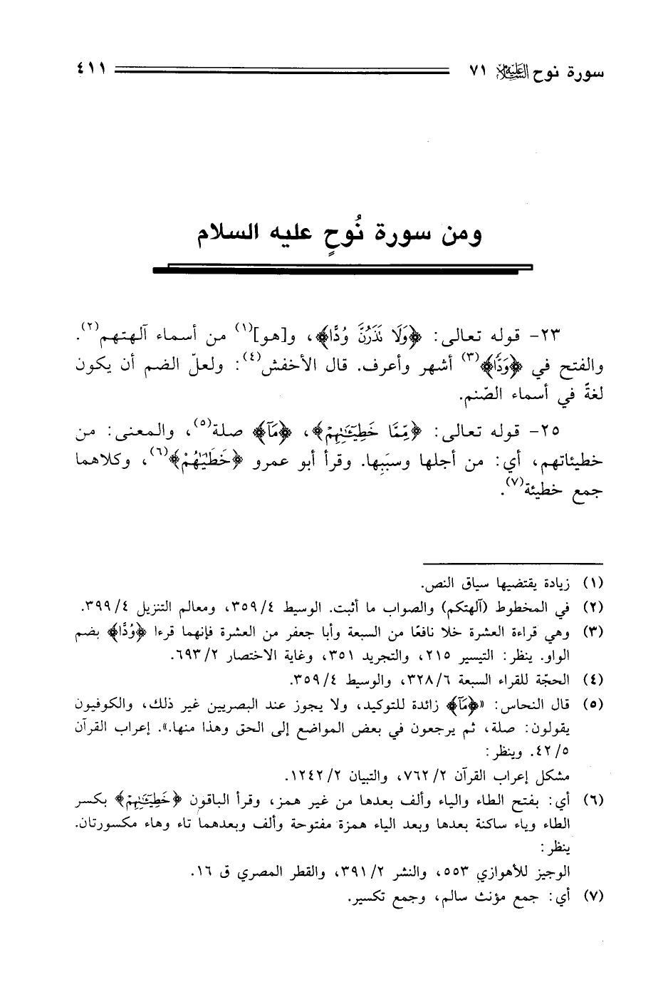 23 - قوله تعالى: (وَلَا تَذَرُنَّ وُدًّا)، [وهو] من أسماء آلهتهم. والفتح في (وَدًّا) أشهر وأعرف. قال الأخفش: ولعلّ الضم أن يكون لغةً في أسماء الصنم.