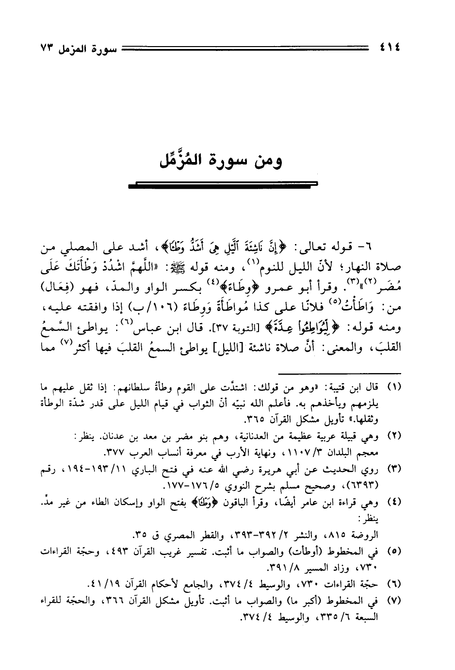 6 - قوله تعالى: (إِنَّ نَاشِئَةَ اللَّيْلِ هِيَ أَشَدُّ وَطْئًا)، أشد على المصلي من صلاة النهار؛ لأنّ الليل للنوم، ومنه قوله - صلى الله عليه وسلم -: "اللهم اشْدُدْ وَطْأَتَكَ عَلَى مُضَر ". وقرأ أبو عمرو (وِطَاءً) بكسر الواو والمدّ، فهو (فِعَال) من: وَاطَأْتُ فلانًا على كذا مُواطَأة وَوِطَاءً إذا وافقته عليه، ومنه قوله: (لِيُوَاطِئُوا عِدَّةَ). قال ابن عباس: يواطئ السمعُ القلبَ، والمعنى: أن صلاة ناشئة [الليل] يواطئ السمعُ القلبَ فيها أكثر مما