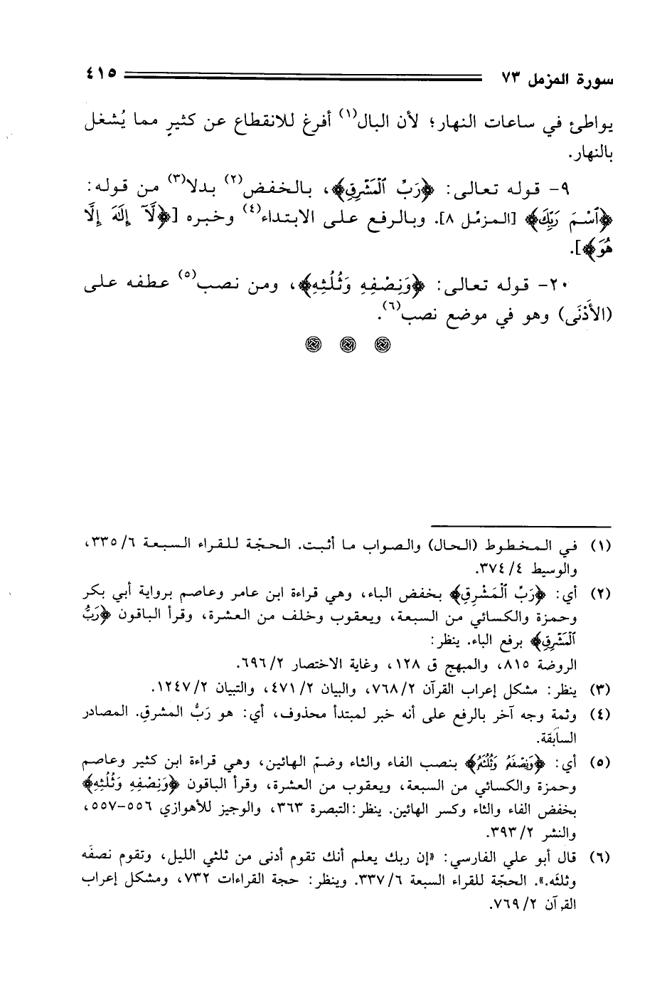 9 - قوله تعالى: (رَبُّ الْمَشْرِقِ)، بالخفض بدلا من قوله: (اسْمَ رَبِّكَ). وبالرفع على الابتداء وخبره (لَا إِلَهَ إِلَّا هُوَ).