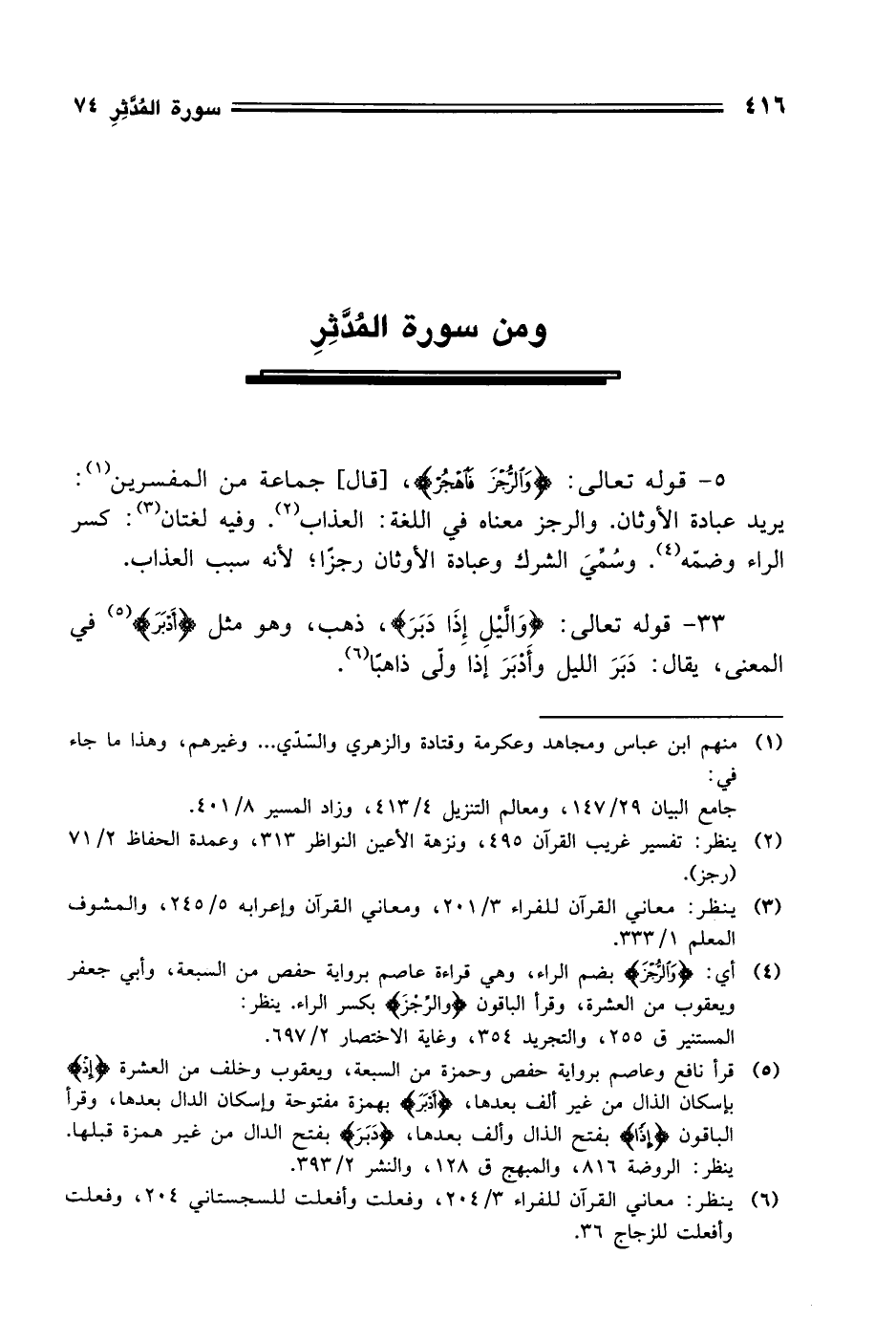 33 - قوله تعالى: (وَاللَّيْلِ إِذَا دَبَرَ)، ذهب، وهو مثل (أَدْبَرَ) في المعنى، يقال: دَبَرَ الليل وأَدْبَرَ إذا ولَّى ذاهبًا.