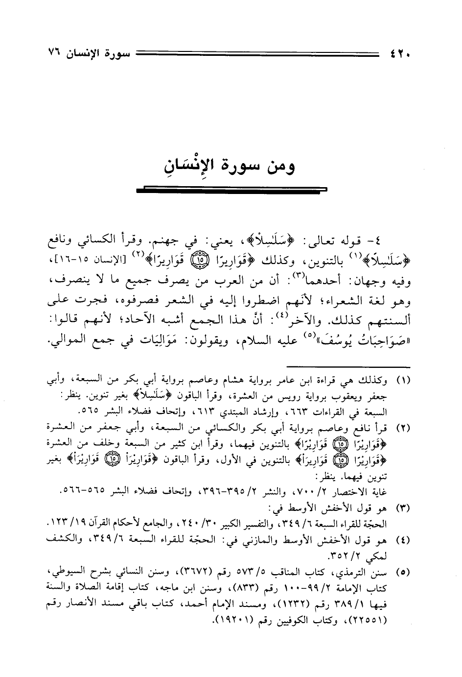 4 - قوله تعالى: (سَلَاسِلَ)، يعني: في جهنم. وقرأ الكسائي ونافع (سَلَاسِلًا) بالتنوين، وكذلك (قَوَارِيرًا قَوَارِيرًا)، وفيه وجهان: أحدهما: أن من العرب من يصرف جميع ما لا ينصرف، وهو لغة الشعراء؛ لأنَّهم اضطروا إليه في الشعر فصرفوه، فجرت على ألسنتهم كذلك. والآخر: أن هذا الجمع أشبه الآحاد؛ لأنهم قالوا: "صَوَاحِبَاتُ يُوسُفَ " عليه السلام، ويقولون: مَوَالِيَات في جمع الموالي.