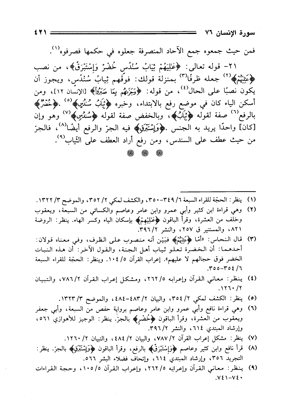 21 - قوله تعالى: (عَالِيَهُمْ ثِيَابُ سُنْدُسٍ خُضْرٌ وَإِسْتَبْرَقٌ)، من نصب (عَالِيَهُمْ) جعله ظرفًا بمنزلة قولك: فوقَهم ثِيابُ سُنْدُسٍ، ويجوز أن يكون نصبًا على الحال، من قوله: (وَجَزَاهُم بِمَا صَبَرُوا)، ومن أسكن الياء كان في موضع رفع بالابتداء، وخبره (ثِيَابُ سُنْدُسٍ). (خُضْرٌ) بالرفع صفة لقوله (ثِيَابُ)، وبالخفض صفة لقوله (سُنْدُسٍ) وهو وإن كان واحدًا يريد به الجنس. (وَإِسْتَبْرَقٍ) فيه الجز والرفع أيضًا، فالجر من حيث عطف على السندس، ومن رفع أراد العطف على الثياب.