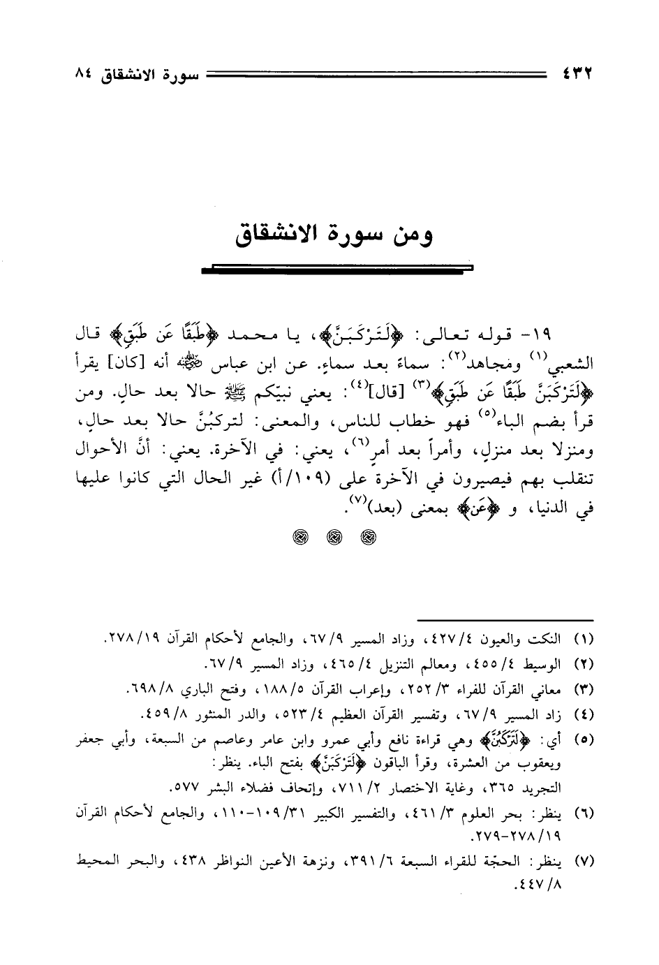 19 - قوله تعالى: (لَتَرْكَبُنَّ)، يا محمد (طَبَقًا عَنْ طَبَقٍ) قال الشعبي ومجاهد: سماءً بعد سماءٍ. عن ابن عباس - رضي الله عنهما - أنه كان يقرأ (لَتَرْكَبَنَّ طَبَقًا عَنْ طَبَقٍ) [قال]: يعني نبيكم - صلى الله عليه وسلم - حالا بعد حالٍ. ومن قرأ بضم الباء فهو خطاب للناس، والمعنى: لتركبُن حالا بعد حالٍ، ومنزلا بعد منزلٍ، وأمرًا بعد أمرٍ، يعني: في الآخرة. يعني: أن الأحوال تنقلب بهم فيصيرون في الآخرة على غير الحال التي كانوا عليها في الدنيا، و (عَن) بمعنى (بعد).