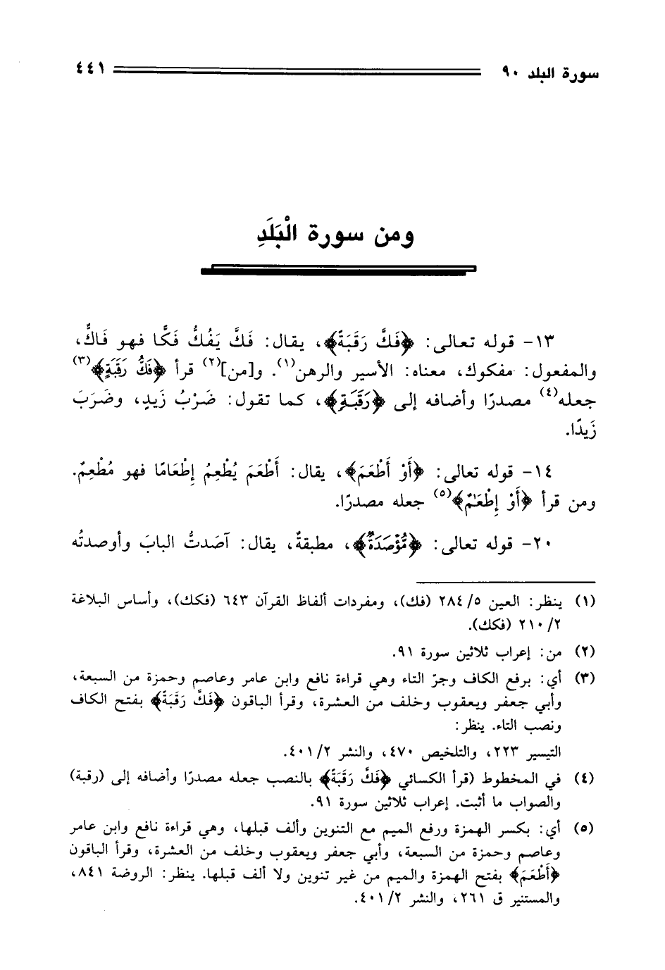 13 - قوله تعالى: (فَكَّ رَقَبَةً)، يقال: فَك يَفُك فَكًّا فهو فَاك، والمفعول: - مفكوك، معناه: الأسير والرهن. و [من] قرأ (فَكُّ رَقَبَةٍ) جعله مصدرًا وأضافه إلى (رَقَبَةٍ)، كما تقول: ضَرْبُ زَيدٍ، وضَرَبَ زيدًا.
