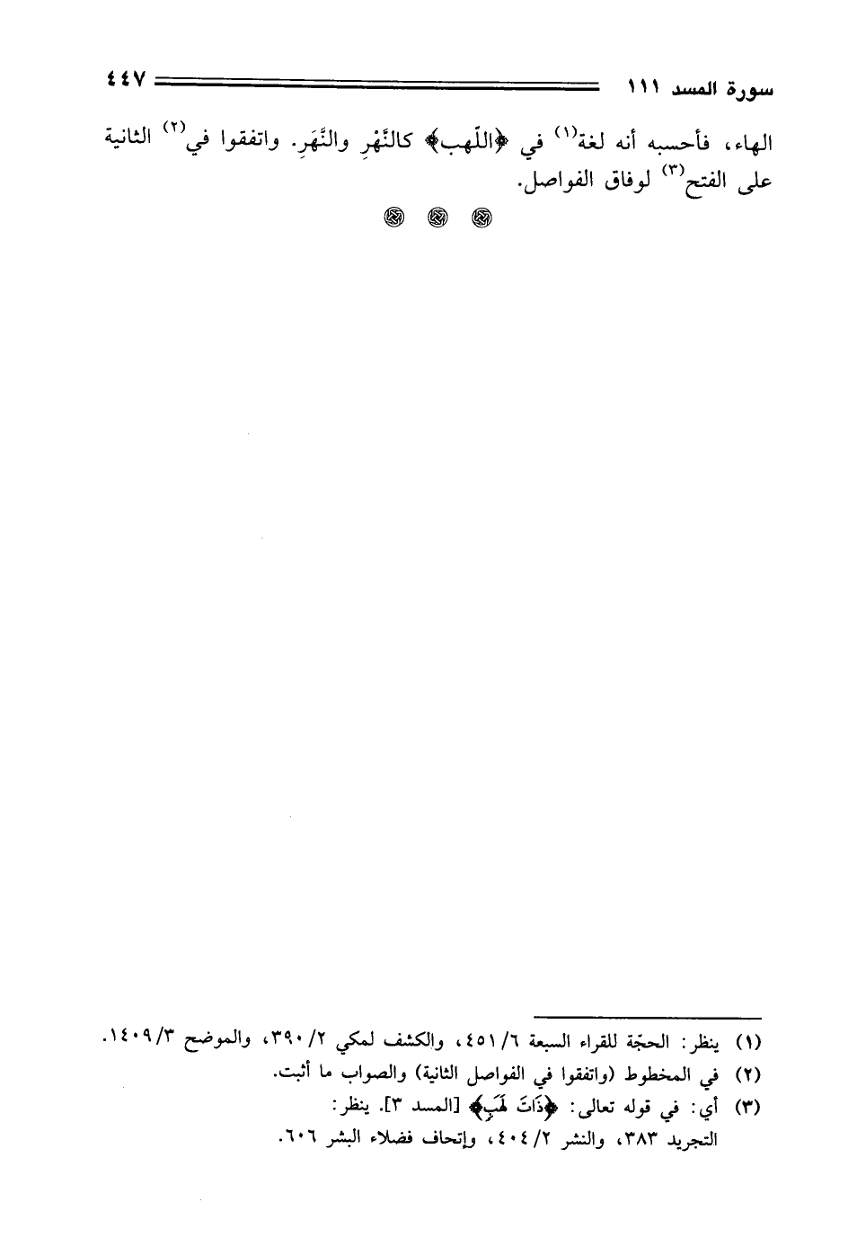 الهاء، فأحسبه أنه لغة في (اللهب) كالنَّهْرِ والنَّهَرِ. واتفقوا في الثانية على الفتح لوفاق الفواصل.