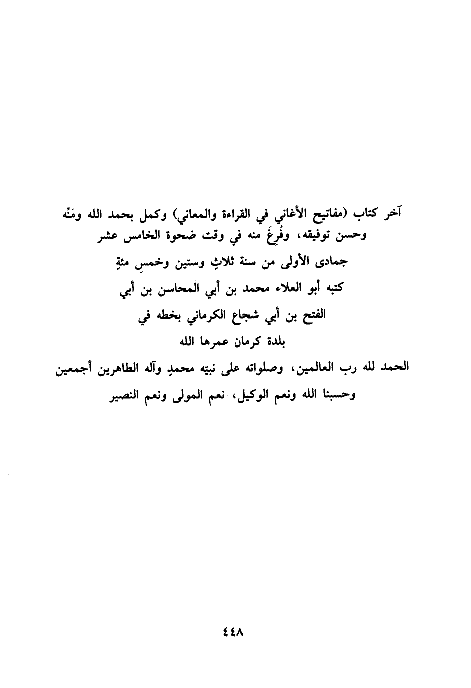 آخر كتاب (مفاتيح الأغاني في القراءة والمعاني) وكمل بحمد الله ومَنِّه وحسن توفيقه، وفرِغَ منه في وقت ضحوة الخامس عشر جمادى الأولى من سنة ثلاث وستين وخمسِ مائةٍ كتبه أبو العلاء محمد بن أبي المحاسن بن أبي الفتح بن أبي شجاع الكرماني بخطه في بلدة كرمان عمرها الله الحمد لله رب العالمين، وصلواته على نبيه محمدٍ وآله الطاهرين أجمعين وحسبنا الله ونعم الوكيل، نعم المولى ونعم النصير