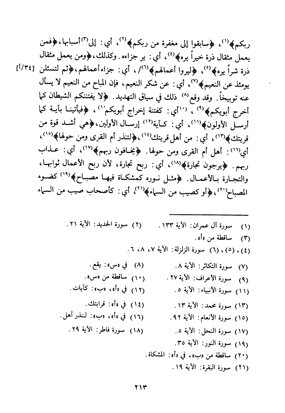 {سابقوا إِلَى مغْفرَة من ربكُم} أَي إِلَى أَسبَابهَا {فَمن يعْمل مِثْقَال ذرة خيرا يره} أَي ير جزاءه وَكَذَلِكَ {وَمن يعْمل مِثْقَال ذرة شرا يره} {ليروا أَعْمَالهم} أَي جَزَاء أَعْمَالهم {ثمَّ لتسألن يَوْمئِذٍ عَن النَّعيم} أَي عَن شكر النَّعيم فَإِن الْمُبَاح من النَّعيم لَا يسْأَل عَنهُ توبيخا وَقد وَقع ذَلِك فِي سِيَاق التهديد {لَا يفتننكم الشَّيْطَان كَمَا أخرج أبويكم} أَي كفتنة إِخْرَاج أبويكم {فليأتنا بِآيَة كَمَا أرسل الْأَولونَ} أَي كآية إرْسَال الْأَوَّلين {هِيَ أَشد قُوَّة من قريتك} أَي من أهل قريتك {لتنذر أم الْقرى وَمن حولهَا} أَي أهل أم الْقرى وَمن حولهَا {يخَافُونَ رَبهم} أَي عَذَاب رَبهم {يرجون تِجَارَة} أَي ربح تِجَارَة لِأَن ربح الْأَعْمَال ثَوَابهَا وَالتِّجَارَة بِالْأَعْمَالِ {مثل نوره كمشكاة فِيهَا مِصْبَاح} كضوء الْمِصْبَاح {أَو كصيب من السَّمَاء} أَي كأصحاب صيب من السَّمَاء
