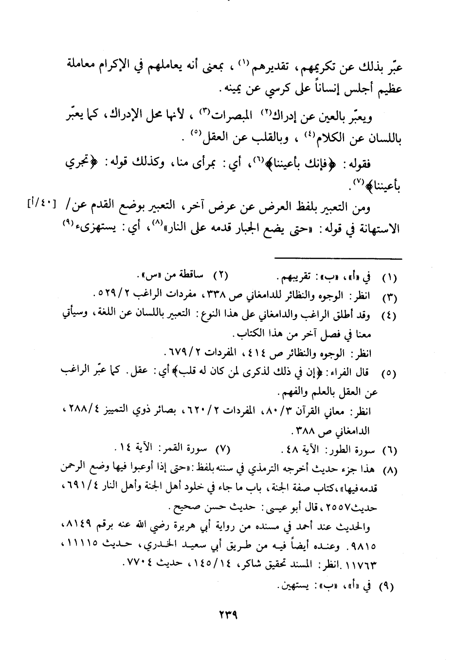 ويعبر بِالْعينِ عَن إِدْرَاك المبصرات لِأَنَّهَا مَحل الْإِدْرَاك كَمَا يعبر بِاللِّسَانِ عَن الْكَلَام وبالقلب عَن الْعقل