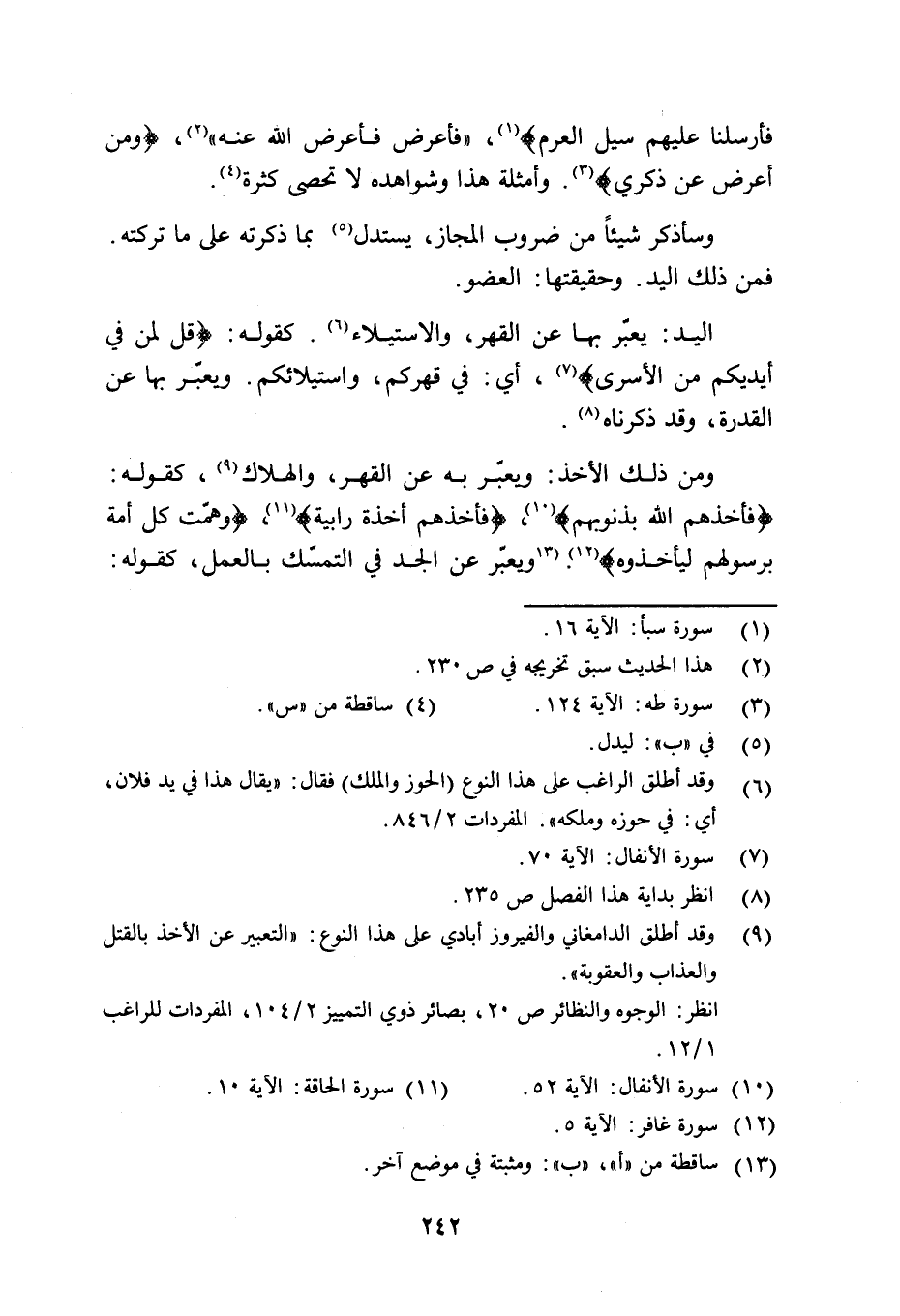 وسأذكر شَيْئا من ضروب الْمجَاز يسْتَدلّ بِمَا ذكرته على مَا تركته فَمن ذَلِك الْيَد وحقيقتها الْعُضْو