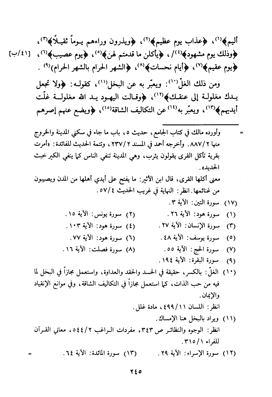 وَمن ذَلِك الغل ويعبر بِهِ عَن الْبُخْل كَقَوْلِه {وَلَا تجْعَل يدك مغلولة إِلَى عُنُقك} {وَقَالَت الْيَهُود يَد الله مغلولة غلت أَيْديهم} ويعبر بِهِ عَن التكاليف الشاقة {وَيَضَع عَنْهُم إصرهم والأغلال الَّتِي كَانَت عَلَيْهِم}