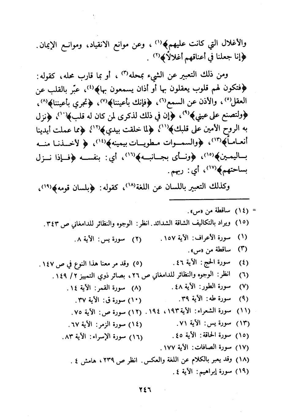 وَمن ذَلِك التَّعْبِير عَن الشَّيْء بمحله أَو بِمَا قَارب مَحَله كَقَوْلِه {فَتكون لَهُم قُلُوب يعْقلُونَ بهَا أَو آذان يسمعُونَ بهَا} عبر بِالْقَلْبِ عَن الْعقل وَالْأُذن عَن السّمع {فَإنَّك بأعيننا} {تجْرِي بأعيننا} {ولتصنع على عَيْني} {إِن فِي ذَلِك لذكرى لمن كَانَ لَهُ قلب} {نزل بِهِ الرّوح الْأمين على قَلْبك} {لما خلقت بيَدي} {مِمَّا عملت أَيْدِينَا أنعاما} {وَالسَّمَاوَات مَطْوِيَّات بِيَمِينِهِ} {لأخذنا مِنْهُ بِالْيَمِينِ} {ونأى بجانبه} أَي بِنَفسِهِ {فَإِذا نزل بِسَاحَتِهِمْ} أَي رَبهم
