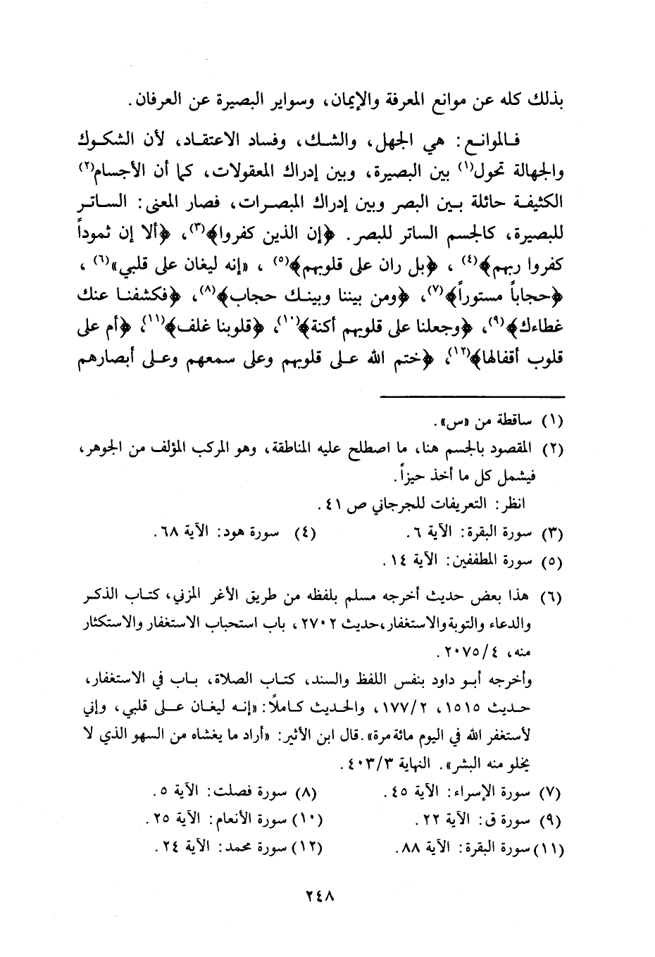 فالموانع هِيَ الْجَهْل وَالشَّكّ وَفَسَاد الِاعْتِقَاد لِأَن الشكوك والجهالة تحول بَين البصيرة وَبَين إِدْرَاك المعقولات كَمَا أَن الْأَجْسَام الكثيفة حائلة بَين الْبَصَر وَبَين إِدْرَاك المبصرات فَصَارَ الْمَعْنى السَّاتِر للبصيرة كالجسم الساكر لِلْبَصَرِ {إِن الَّذين كفرُوا} {أَلا إِن ثَمُود كفرُوا رَبهم} {بل ران على قُلُوبهم} إِنَّه ليغان على قلبِي {حِجَابا مَسْتُورا} {وَمن بَيْننَا وَبَيْنك حجاب} {فكشفنا عَنْك غطاءك} {وَجَعَلنَا على قُلُوبهم أكنة} {قُلُوبنَا غلف} {أم على قُلُوب أقفالها} {ختم الله على قُلُوبهم وعَلى سمعهم وعَلى أَبْصَارهم غشاوة}