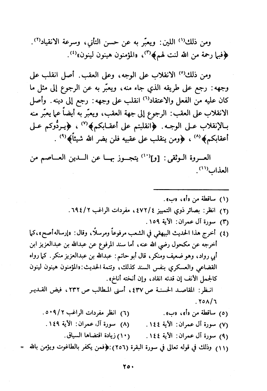 وَمن ذَلِك الانقلاب على الْوَجْه وعَلى الْعقب أصل انْقَلب على وَجهه رَجَعَ على طَرِيقه الَّذِي جَاءَ مِنْهُ ويعبر بِهِ عَن الرُّجُوع إِلَى مثل مَا كَانَ عَلَيْهِ من الْفِعْل والاعتقاد انْقَلب على وَجهه رَجَعَ إِلَى دينه وأصل الانقلاب على الْعقب الرُّجُوع إِلَى جِهَة الْعقب ويعبر بِهِ أَيْضا عَمَّا يعبر مِنْهُ بالإنقلاب على الْوَجْه {انقلبتم على أعقابكم} {يردوكم على أعقابكم} {وَمن يَنْقَلِب على عَقِبَيْهِ فَلَنْ يضر الله شَيْئا}