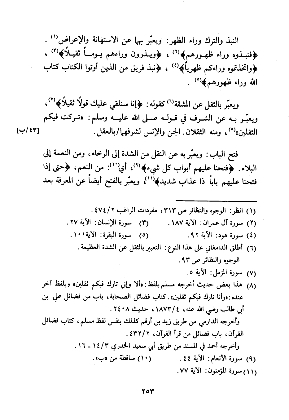 ويعبر بالثقل عَن الْمَشَقَّة كَقَوْلِه {إِنَّا سنلقي عَلَيْك قولا ثقيلا} ويعبر بِهِ عَن الشّرف فِي قَوْله صلى الله عَلَيْهِ وَسلم تركت فِيكُم الثقلَيْن وَمِنْه الثَّقَلَان الْجِنّ وَالْإِنْس لِشَرَفِهِمَا بِالْعقلِ