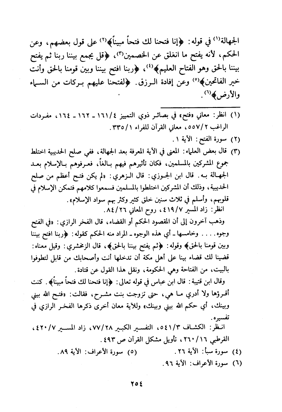 الْجَهَالَة فِي قَوْله {إِنَّا فتحنا لَك فتحا مُبينًا} على قَول بَعضهم وَعَن الحكم لِأَنَّهُ يفتح مَا انغلق عَن الْخَصْمَيْنِ {قل يجمع بَيْننَا رَبنَا ثمَّ يفتح بَيْننَا بِالْحَقِّ وَهُوَ الفتاح الْعَلِيم} {رَبنَا افْتَحْ بَيْننَا وَبَين قَومنَا بِالْحَقِّ وَأَنت خير الفاتحين} وَعَن إِفَادَة الرزق {لفتحنا عَلَيْهِم بَرَكَات من السَّمَاء وَالْأَرْض}