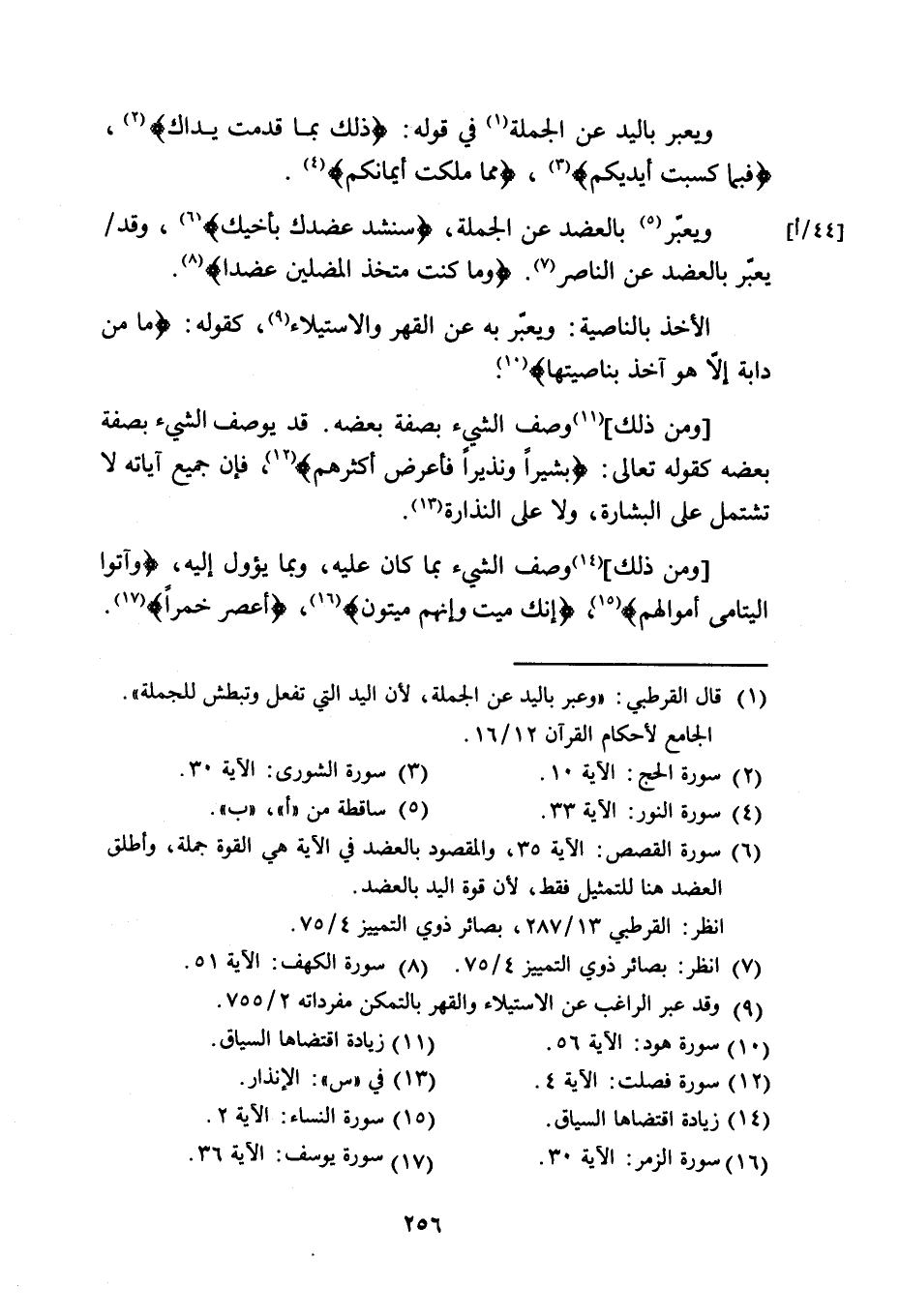 ويعبر بِالْيَدِ عَن الْجُمْلَة فِي قَوْله {ذَلِك بِمَا قدمت يداك} {فبمَا كسبت أَيْدِيكُم} {مِمَّا ملكت أَيْمَانكُم}