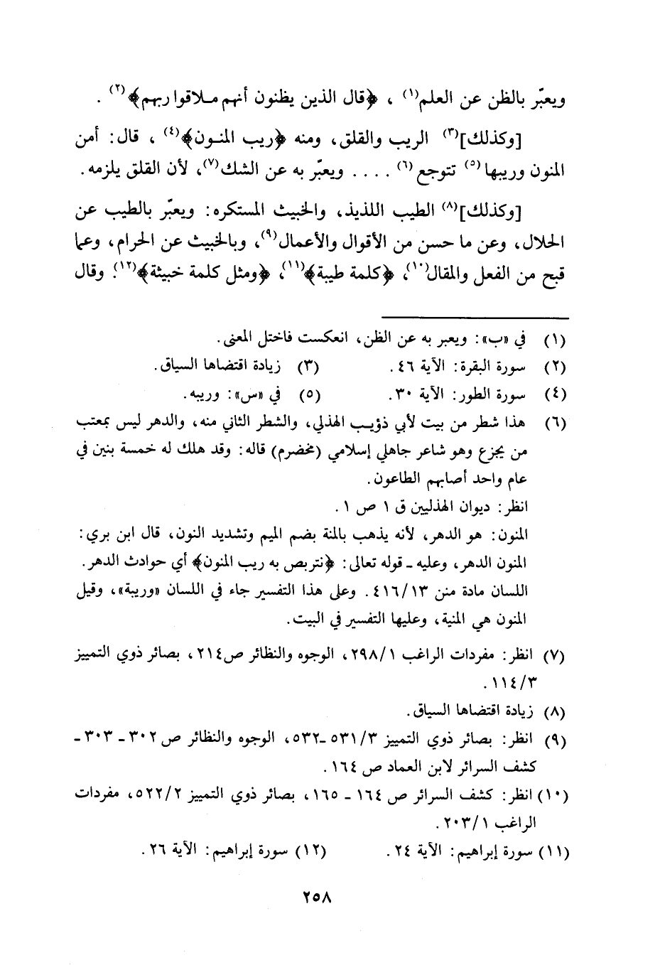 وَكَذَلِكَ الطّيب اللذيذ والخبيث المستكره ويعبر بالطيب عَن الْحَلَال وَعَن مَا حسن من الْأَقْوَال والأعمال وبالخبيث عَن الْحَرَام وَعَما قبح من الْفِعْل والمقال {كلمة طيبَة} {وَمثل كلمة خبيثة} وَقَالَ
