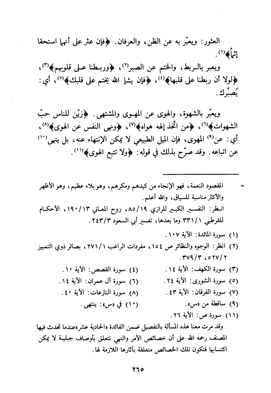 ويعبر بالشهوة والهوى عَن المهوى والمشتهى {زين للنَّاس حب الشَّهَوَات} {من اتخذ إلهه هَوَاهُ} {وَنهى النَّفس عَن الْهوى} أَي عَن المهوى فَإِن الْميل الطبيعي لَا يُمكن الإنتهاء عَنهُ بل ينْهَى عَن اتِّبَاعه وَقد صرح بذلك فِي قَوْله {وَلَا تتبع الْهوى}