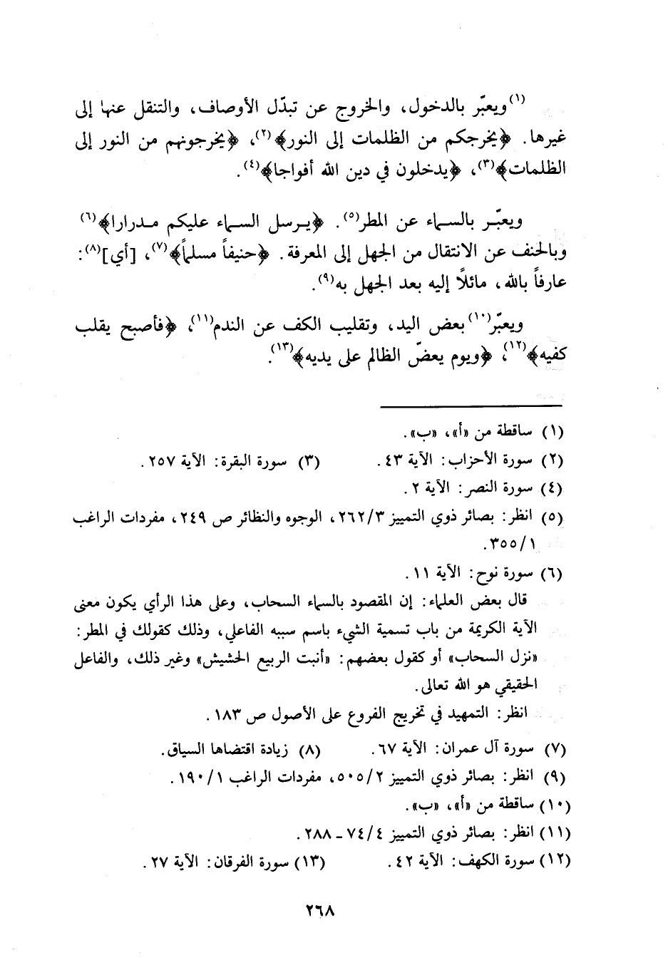 ويعبر بالسماء عَن الْمَطَر {يُرْسل السَّمَاء عَلَيْكُم مدرارا} وبالحنف عَن الِانْتِقَال من الْجَهْل إِلَى الْمعرفَة {حَنِيفا مُسلما} أَي عَارِفًا بِاللَّه مائلا إِلَيْهِ بعد الْجَهْل بِهِ