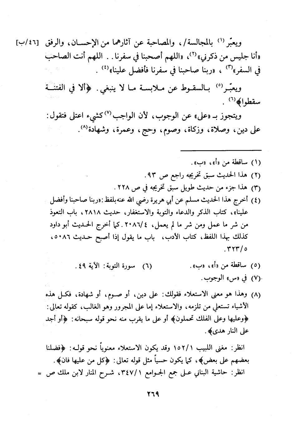 ويتجوز ب على عَن الْوُجُوب لِأَن الْوَاجِب كشيء اعتلى فَتَقول على دين وَصَلَاة وَزَكَاة وَصَوْم وَحج وَعمرَة وَشَهَادَة