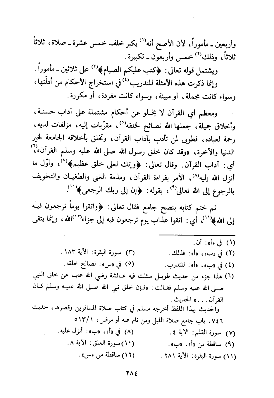 ومعظم أَي الْقُرْآن لَا يَخْلُو عَن أَحْكَام مُشْتَمِلَة على آدَاب حَسَنَة وأخلاق جميلَة جعلهَا الله نصائح لخلقه مقربات إِلَيْهِ مزلفات لَدَيْهِ رَحْمَة لِعِبَادِهِ فطوبى لمن تأدب بآداب الْقُرْآن وتخلق بأخلاقه الجامعة لخير الدُّنْيَا وَالْآخِرَة وَقد كَانَ خلق رَسُول الله صلى الله عَلَيْهِ وَسلم الْقُرْآن أَي آدَاب الْقُرْآن وَقَالَ تَعَالَى {وَإنَّك لعلى خلق عَظِيم} وَأول مَا أنزل الله إِلَيْهِ الْأَمر بِقِرَاءَة الْقُرْآن ومذمة الْغنى والطغيان والتخويف بِالرُّجُوعِ إِلَى الله تَعَالَى بقوله {إِن إِلَى رَبك الرجعى}