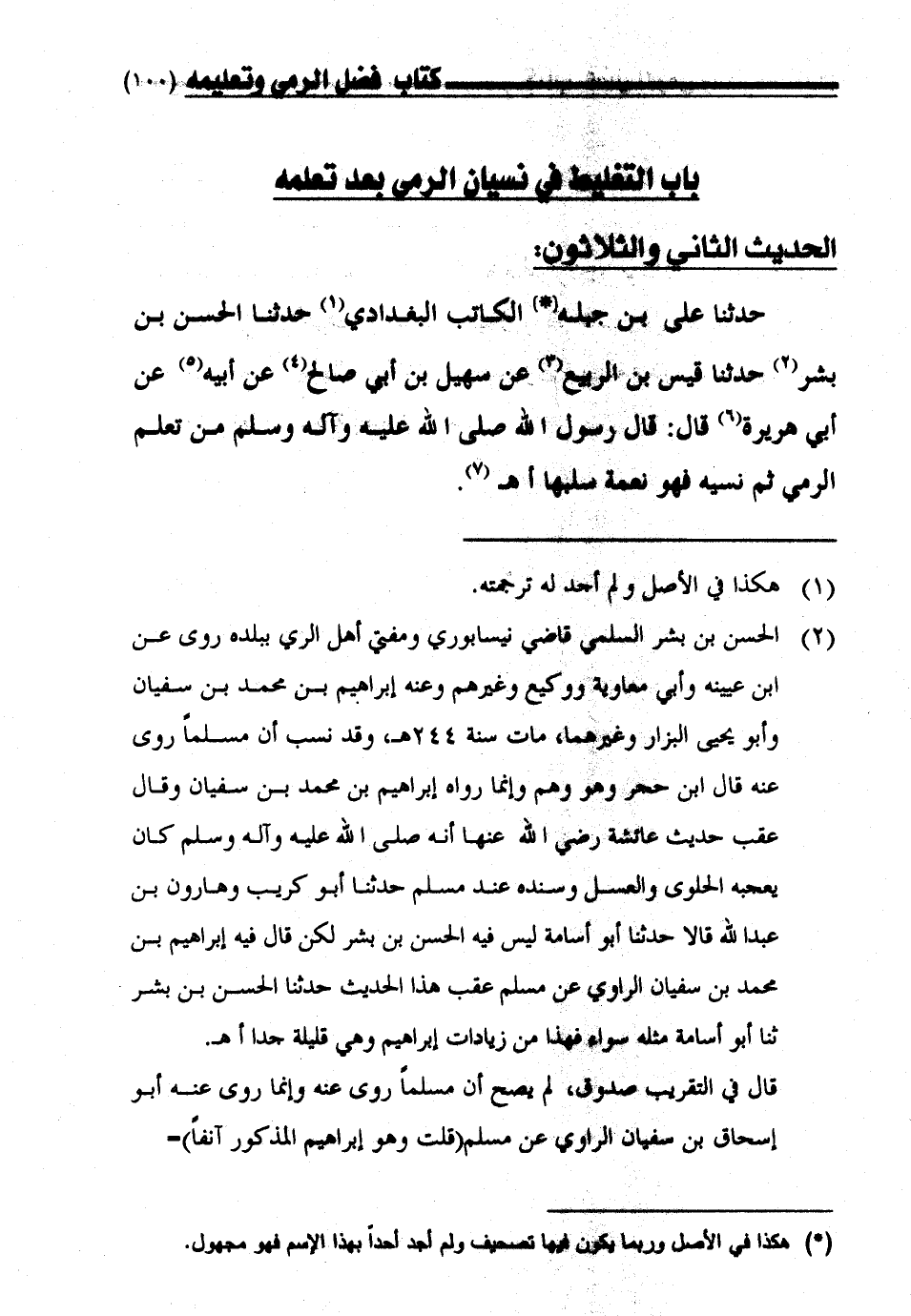 35 - حَدَّثَنَا عَلِيُّ بْنُ جَبَلَةَ الْكَاتِبُ الْبَغْدَادِيُّ، حَدَّثَنَا الْحَسَنُ بْنُ بِشْرٍ، حَدَّثَنَا قَيْسُ بْنُ الرَّبِيعِ، عَنْ سُهَيْلِ بْنِ أَبِي صَالِحٍ، عَنْ أَبِيهِ، عَنْ أَبِي هُرَيْرَةَ، قَالَ: قَالَ رَسُولُ اللَّهِ صَلَّى اللَّهُ عَلَيْهِ وَسَلَّمَ: «§مَنْ تَعَلَّمَ الرَّمْيَ، ثُمَّ نَسِيَهُ؛ فَهُوَ نِعْمَةٌ سُلِبَهَا»