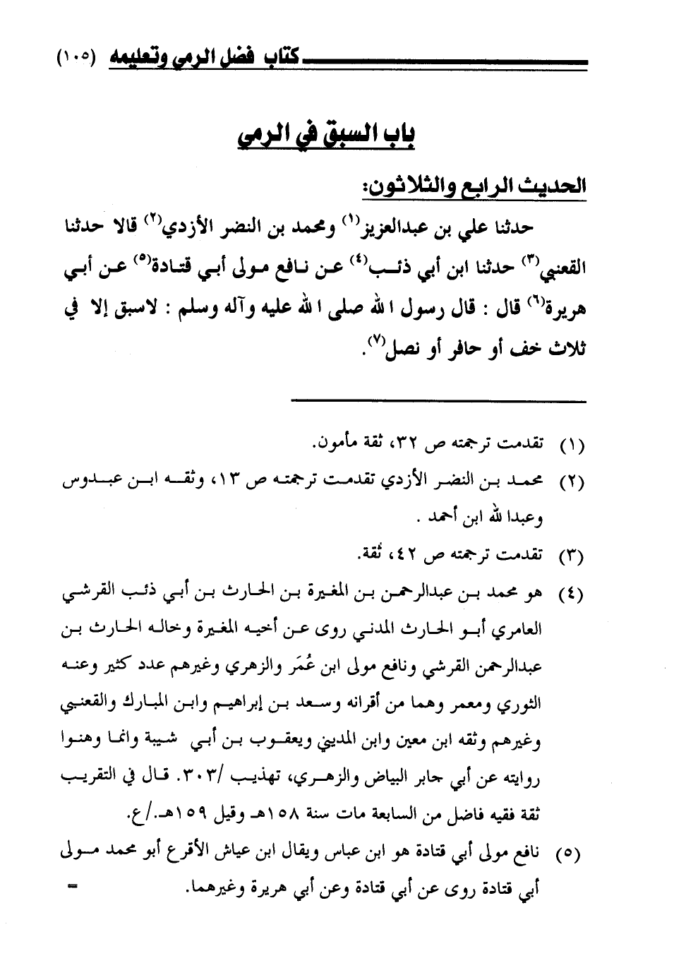 37 - حَدَّثَنَا عَلِيُّ بْنُ عَبْدِ الْعَزِيزِ، وَمُحَمَّدُ بْنُ النَّضْرِ الْأَزْدِيُّ، قَالَا: حَدَّثَنَا الْقَعْنَبِيُّ، حَدَّثَنَا ابْنُ أَبِي ذِئْبٍ، عَنْ نَافِعٍ، مَوْلَى أَبِي قَتَادَةَ عَنْ أَبِي هُرَيْرَةَ، قَالَ: قَالَ رَسُولُ اللَّهِ صَلَّى اللَّهُ عَلَيْهِ وَسَلَّمَ: «§لَا سَبْقَ إِلَّا فِي خُفٍّ أَوْ حَافِرٍ أَوْ نَصْلٍ» -[107]- حَدَّثَنَا إِسْمَاعِيلُ بْنُ الْحَسَنِ الْخَفَّافُ الْمِصْرِيُّ، حَدَّثَنَا زُهَيْرُ بْنُ عَبَّادٍ، حَدَّثَنَا مُصْعَبُ بْنُ مَاهَانَ،: حَدَّثَنَا سُفْيَانُ الثَّوْرِيُّ، عَنِ ابْنِ أَبِي ذِئْبٍ، وَمُحَمَّدُ بْنُ عَمْرٍو، عَنْ نَافِعٍ، مَوْلَى أَبِي قَتَادَةَ عَنْ أَبِي هُرَيْرَةَ، عَنِ النَّبِيِّ صَلَّى اللَّهُ عَلَيْهِ وَسَلَّمَ مِثْلَهُ