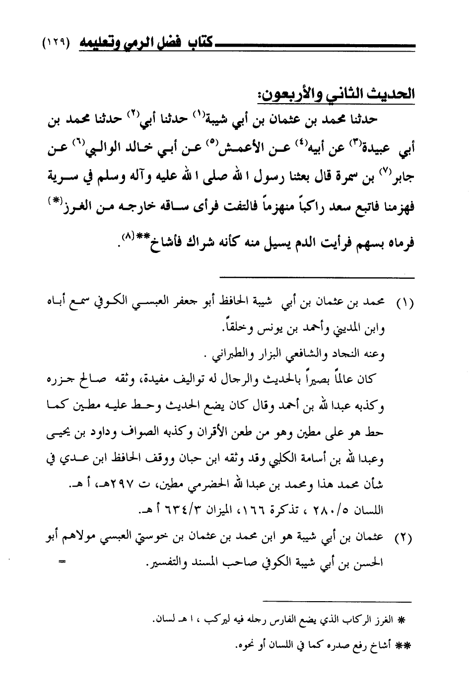 44 - حَدَّثَنَا مُحَمَّدُ بْنُ عُثْمَانَ بْنِ أَبِي شَيْبَةَ، حَدَّثَنَا أَبِي، حَدَّثَنَا مُحَمَّدُ بْنُ أَبِي عُبَيْدَةَ، عَنْ أَبِيهِ، عَنِ الْأَعْمَشِ، عَنْ أَبِي خَالِدٍ الْوَالِبِيُّ، عَنْ جَابِرِ بْنِ سَمُرَةَ، قَالَ: §بَعَثَنَا رَسُولُ اللَّهِ صَلَّى اللَّهُ عَلَيْهِ وَسَلَّمَ فِي سَرِيَّةٍ، فَهَزَمْنَا، فَاتَّبَعَ سَعْدٌ رَاكِبًا مِنْهُمْ، فَالْتَفَتَ إِلَيْهِ، فَرَأَى سَاقَهُ خَارِجَةً مِنَ الْغَرْزِ، فَرَمَاهُ بِسَهْمٍ، فَرَأَيْتُ الدَّمَ يَسِيلُ كَأَنَّهُ شِرَاكٌ، فَأَنَاخَ "