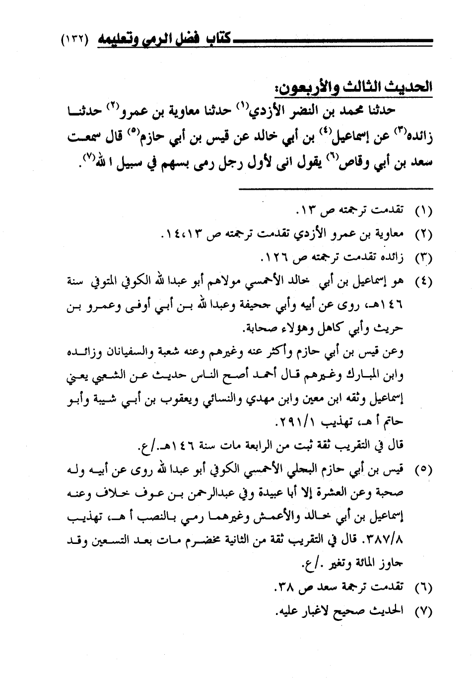 45 - حَدَّثَنَا مُحَمَّدُ بْنُ النَّضْرِ، حَدَّثَنَا مُعَاوِيَةُ بْنُ عَمْرٍو، حَدَّثَنَا زَائِدَةُ، عَنْ إِسْمَاعِيلَ بْنِ أَبِي خَالِدٍ، عَنْ قَيْسِ بْنِ أَبِي حَازِمٍ، قَالَ: سَمِعْتُ سَعْدَ بْنَ أَبِي وَقَّاصٍ، يَقُولُ: «§إِنِّي لَأَوَّلُ رَجُلٍ رَمَى بِسَهْمٍ فِي سَبِيلِ اللَّهِ»